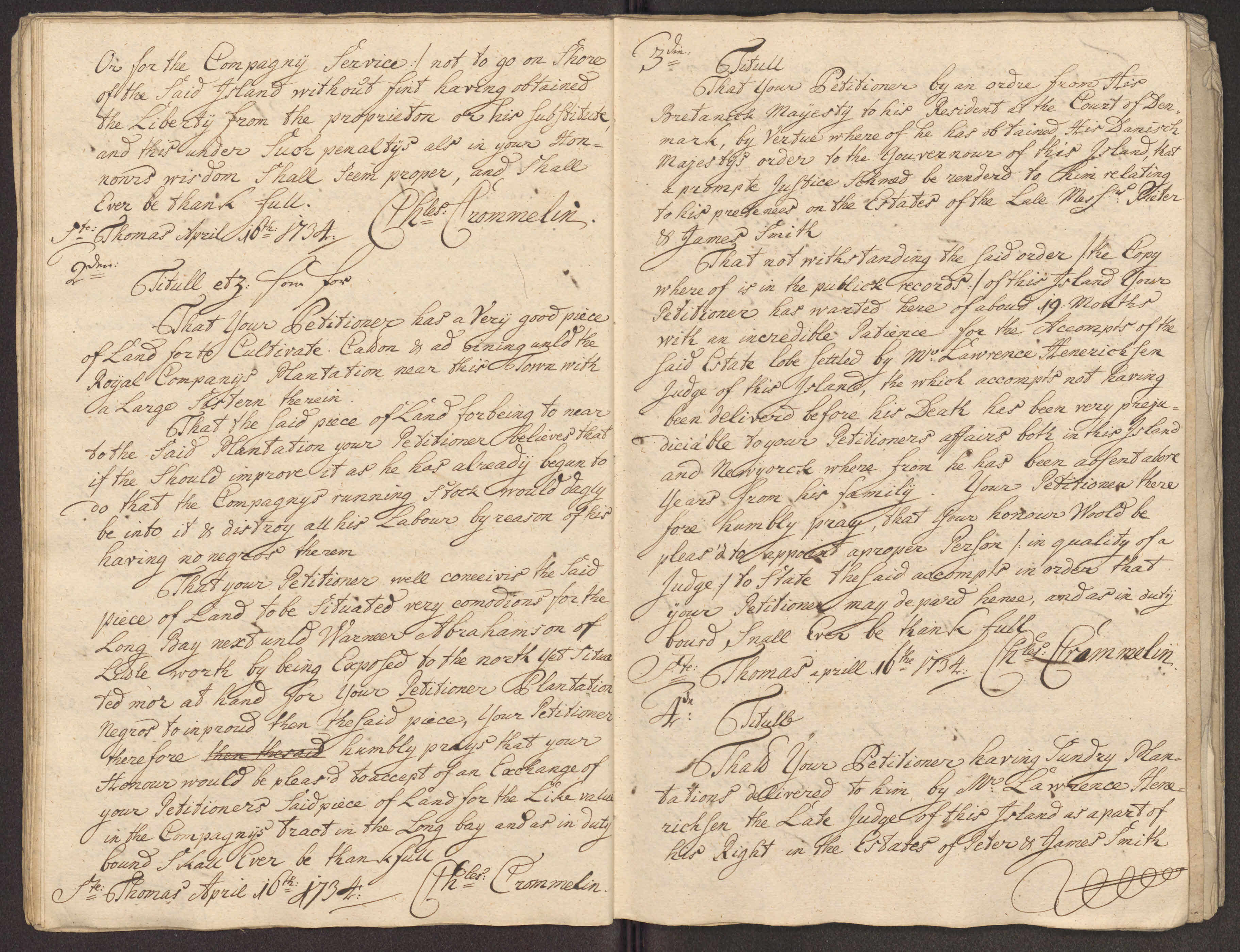 4th TitullWhereas your Petitioner having sundry Plantations delivered to him by Mr. Lawrence Henericksen, the late Judge of this Island, is a part of his right in the Estates of Peter & James Smith,