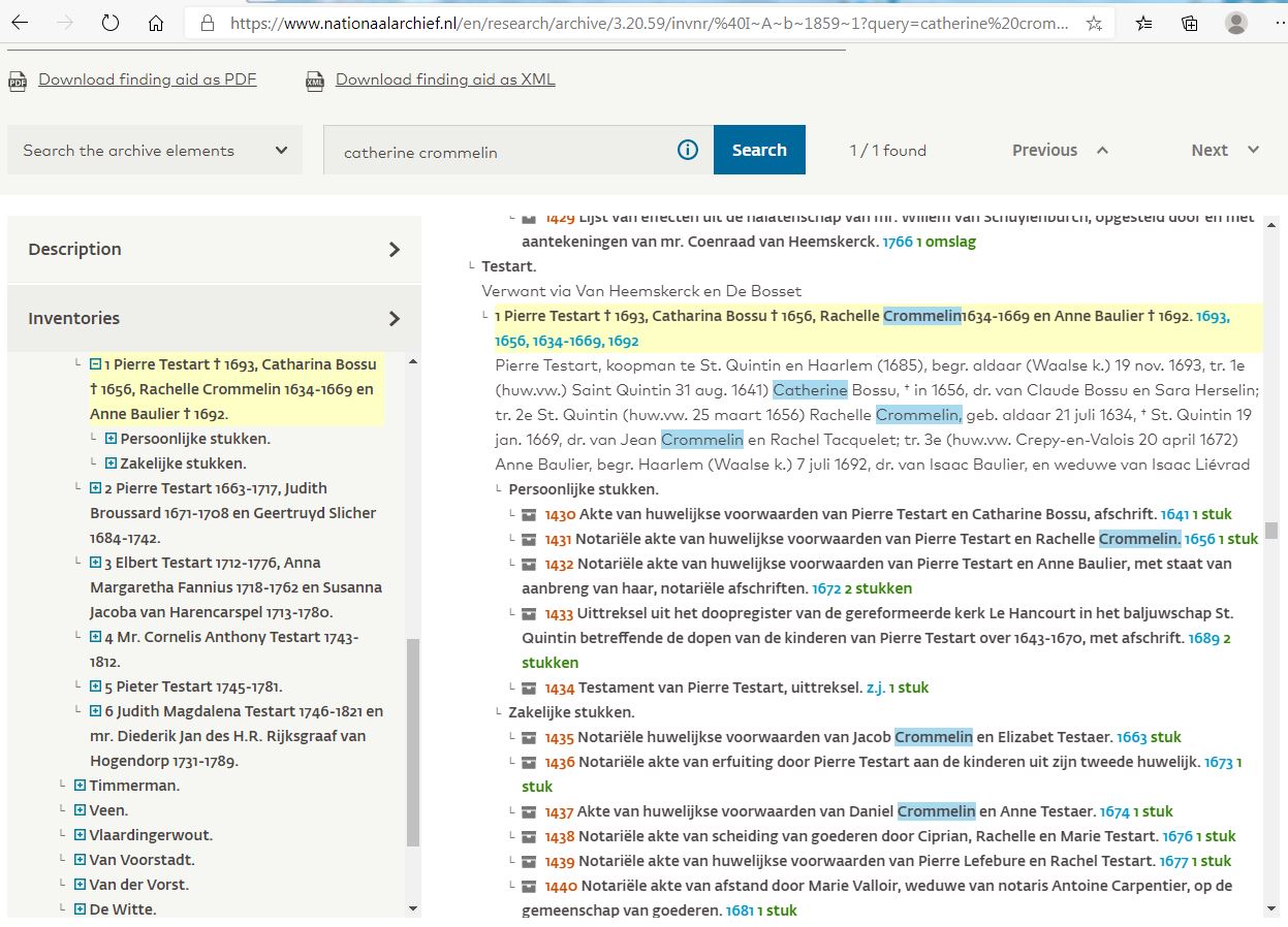 Research Centre: Here you will find interesting sources of information such as the whereabouts of important Last Wills and Testaments. They usually contain a great deal of genealogical information for family historians should they wish to conduct their own private research. Last Wills & Testaments Many Last Wills, Testaments, and other documents can be accessed through the U.K. National Archives. A search for "Crommelin" or "Testart" should bring up many documents. There is a nominal charge (today £3.50) for each of the data. Just a few examples: Will of Charles Crommelin of New York