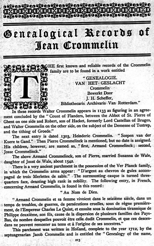 Crommelin Genealogy by Jacob Crommelin, 1712