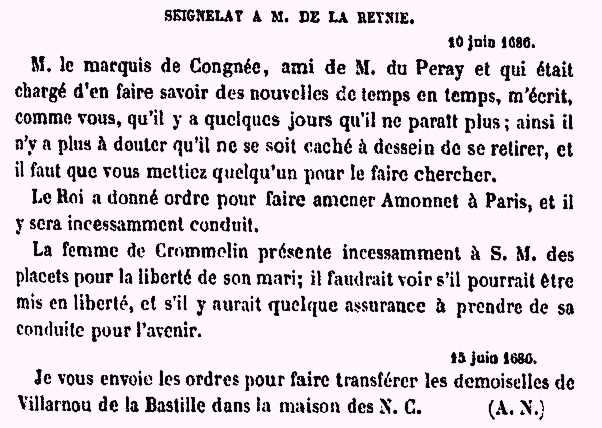 J'ai remis entre les mains du capitaine des gardes du corps du Roi, le signal de Crommelin; je vous prie de ne pas perdre cette affaire de vue et de tâcher de faire exécuter promptement l'ordre que vous trouverez ci-joint pour le faire arrêter; mettez, sil vous plait, Desgrez et Auzillon après lui, et faites en sorte que cet homme ne puisse échapper...I handed the captain of the King's bodyguards the order regarding Crommelin. Please do not lose sight of this business and try to expedite the order promptly that you will find herewith to have him arrested. Please set Desgrez and Auzillon upon him and make sure this man cannot escape.