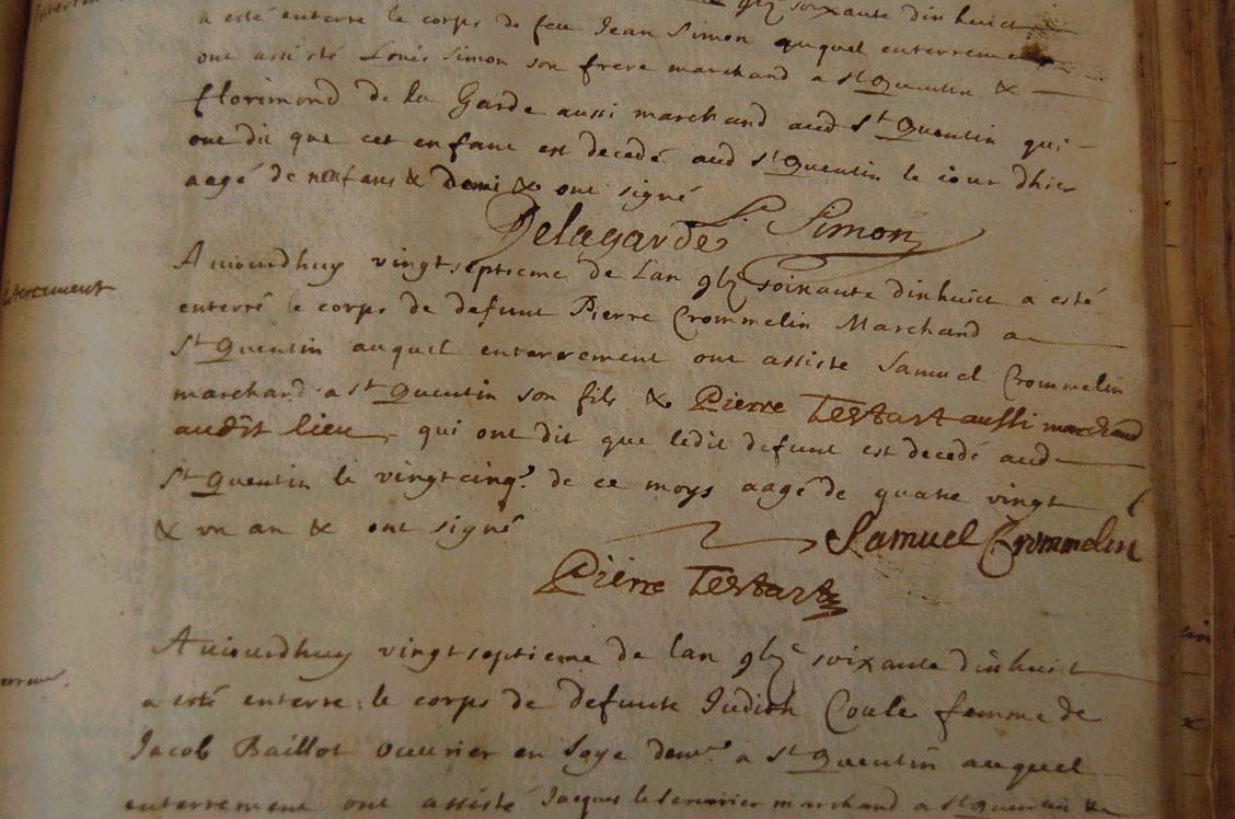 At this time, the senior canonry and chapter of the royal and pro-Episcopal church of Saint-Quentin petitioned against three other members of the Huguenot church: Samuel Mettayer, Elisabeth Bossu and Marie Testart. Six major charges were drawn up against Reverend Mettayer.