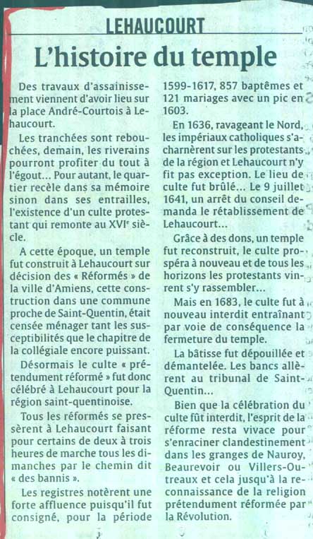 At that time, a temple was built in Lehaucourt by decision of the "Reformed" people of the town of Amiens. This construction, in a parish close to Saint-Quentin, was meant neither to offend local feelings nor the rules of the powerful collegiate church.