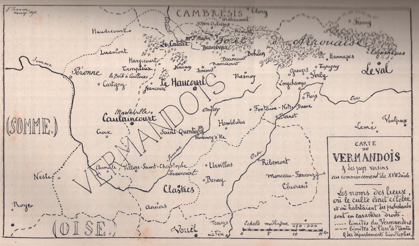 The extent of the parish coincided somewhat with that of Vermandois in the 17th century. It probably encompassed the cantons of Catelet, Bohain, Vermand, Saint-Quentin and Saint-Simon, a portion of the canton of Guise located on the right bank of the Oise, almost all of the canton of Moy in Aisne, a portion of the cantons of Ham and Roisel in the Somme, the villages of Villers-Outréaux, Malincourt, and others in the North.