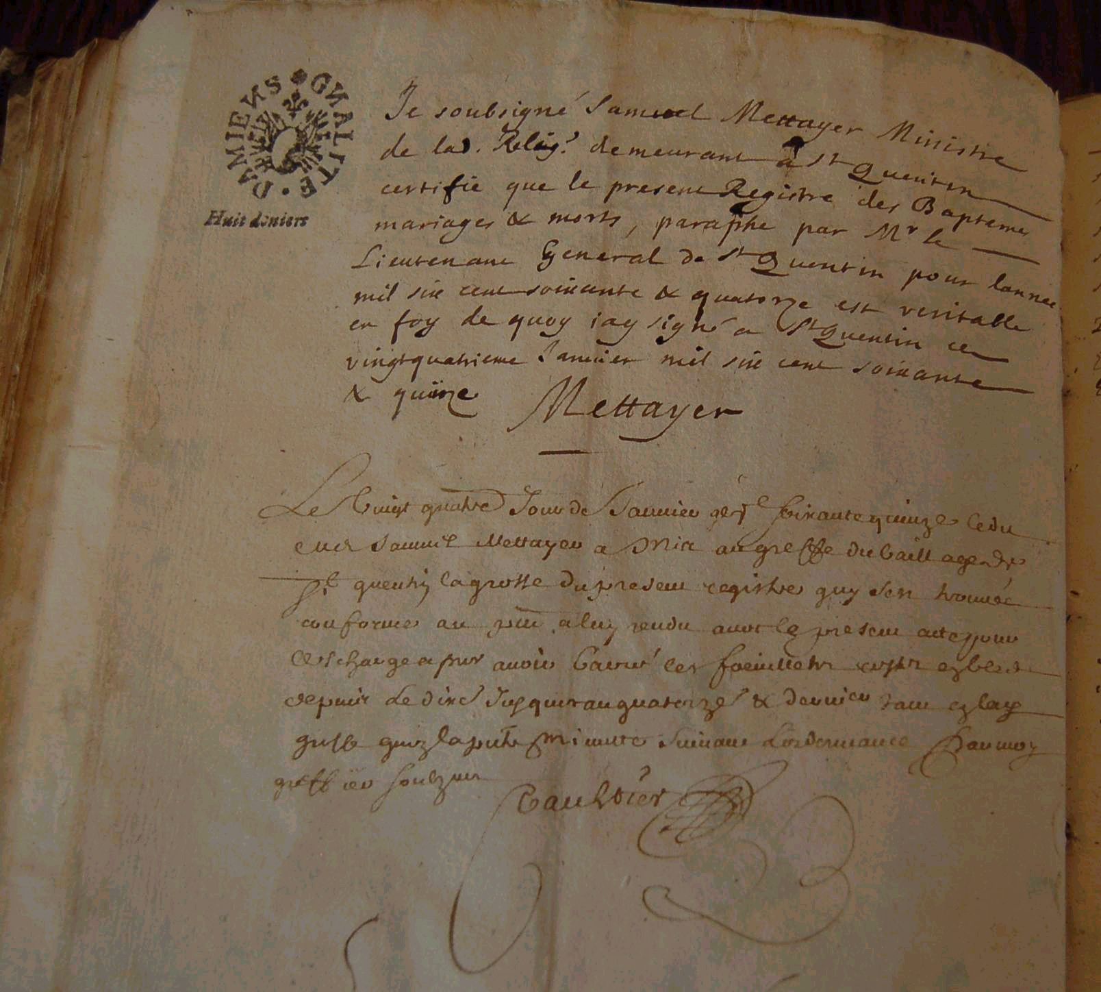 "The undersigned Samuel Mettayer, minister of religion living at St. Quentin, certifies that the Register presented of baptisms, marriages and deaths, inspected by the Lieutenant General of St. Quentin for the year 1674 is true and faithful to which I hereby sign at St. Quentin on the 24th of January, 1675 - Mettayer"