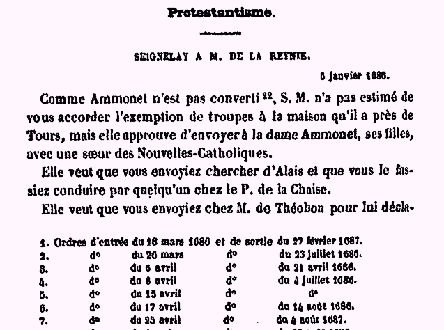 5 January 1686As Ammonet is not converted (Ammonet, an elder of the consistory of Charenton, was obstinate), S.M. (his majesty) did not see fit to grant you the exemption of troops to the house which he has near Tours, but he did approve sending them to the wife of Ammonet, her daughters, and a sister who is a New-catholic.