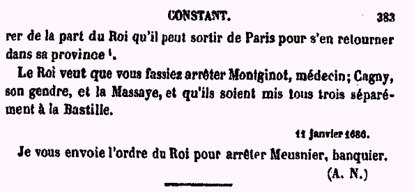 Le Roi veut que vous fassiez arreter Moniginot, médecin; Cagny, son gendre, et la Massaye, et qu'ils soient mis tous trois séparément à la Bastille.