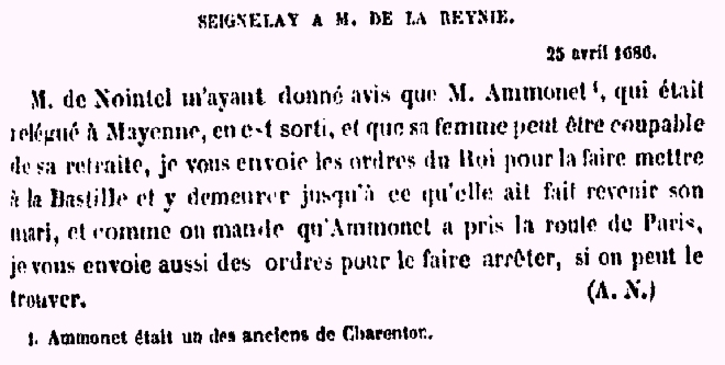 M. de Nointel m'ayant donné avis que M. Ammonet (Ammonet etait un des anciens de Charenton), qui etait rélégue a Mayenne, en est sorti, et que sa femme peut être coupable de sa retraite, je vous envoie les ordres du Roi pour la faire mettre à la Bastille et y demeurer jusqu'a ce qu'elle ait fait revenire son mari, et comme on mande qu'Ammonet a pris la route de Paris, je vous envoie aussi des ordres pour le faire arrêter, si on peut le trouver.