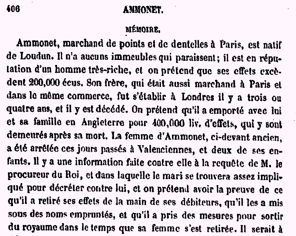 Ammonet, marchand de points et de dentelles à Paris, est natif de Loudun. Il n'a aucuns immeubles qui paraissent; il est en réputation d'un homme très-riche, et on prétend que ses effets excèdent 200,000 écus. Son frère, qui était aussi marchand à Paris et dans le même commerce, fut s'établir à Londres il y a trois ou quatre ans, et il y est décédé. On prétend qu'il a emporté avec lui et sa famille en Angleterre pour 400,000 liv. d'effets, qui y sont demeurés après sa mort. La femme d'Ammonet, ci-devant ancien, a été arrêtée ces jours passés à Valenciennes, et deux de ses enfants.