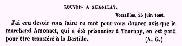 23 June 1686, VersaillesJ'ai cru devoir vous faire ce mot pour vous donner avis que le marchand Ammonet, qui a été prisonnier à Tournay, en est parti pour être transféré à la Bastille.