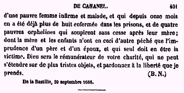 De la Bastille, 20 September 1686J'ai vu M. Chardon, par la permission que vous m'avez donnée, qui m'a dit les supplications qu'il avait eu l'honneur de vous faire pour une pauvre désolée famille. Ce n'est pas moi qui vous demande ma liberté; puisque je suis si coupable, il est juste que je souffre pour la punition de mes crimes; mais ayez compassion d'une pauvre femme infirme et malade, et qui depuis onze mois en a été déjà plus de huit enfermee dans les prisons, et de quatre pauvres orphelines qui soupirent sans cesse après leur mère; done la mère et les enfants n'ont en ceci d'autre péché que l'imprudence d'un père et d'un époux, et qui seul doit en être la victime. Dieu sera le rémunérateur de votre charité, qui ne peut s'étendre sur de plus tristes objets, et pardonnez à la liberté que je prends.