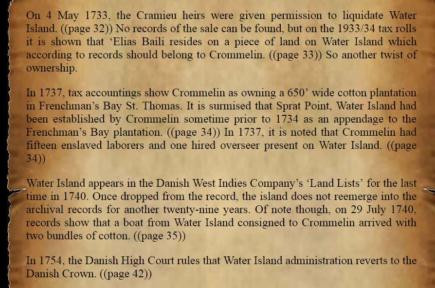 We believe that Charles either owned or was involved in plantations on St. Thomas [and Water Island, just off the south coast of St. Thomas], and on St. John where a slave rebellion took place in 1733. Judging from the vast number of owners that appears in the index, one must assume that each plantation was of no great size but still sufficient from which to derive a profitable income.