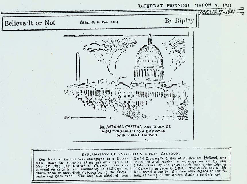 About the time that Willink provided money for the Morris canal in the Netherlands, Daniël Crommelin & Soonen brought to market a stock issue worth $3,750,000 on a foundation of 5 ½% debentures on behalf of the cities of Washington, Georgetown and Alexandria who wanted to raise money to finance their part in the Chesapeake & Ohio Canal Company. That way they would try to revive the recently restarted Potomac Plan.