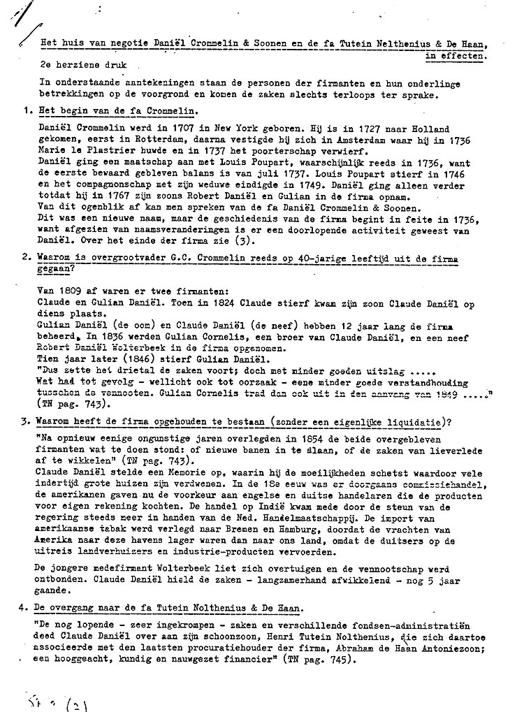 Finally, the following literature contains much information about the firm and its members: P.J. Winter, “The participation of the business community of Amsterdam with the building of the American Commonwealth, I and II (The Hague, 1927 and 1933); R.P.J. Tutein Nolthenius, see above, and J.H. Scheffer, genealogy of the family Crommelin (Rotterdam, 1878). The latter two are probably not available in public libraries but rather in archival libraries.