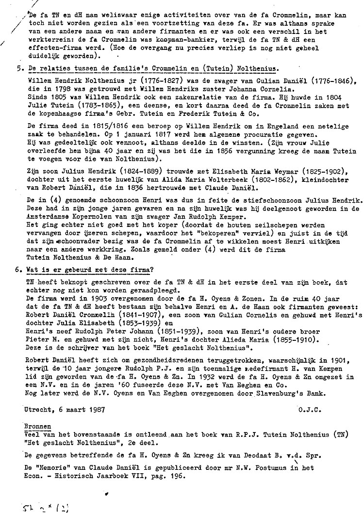 In 1737 Daniël Crommelin started a business with Louis Poupart who died in 1747. The sons Robert Daniël and Gulian were taken on by the firm so that one can only then speak of the firm Crommelin en Soonen. Nothing points at a liquidation as such. Business continued, after the death of Claude Daniël, by Tutein Nolthenius and De Haan. For clarification I include, here with a copy from R.P.J. Tutein Nolthenius. The family Nolthenius, part II (Haarlem, 1930, not commercially available) Page 788, in which the members of the firm are shown.