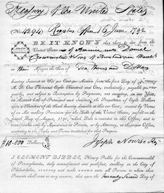 French and Dutch investors were the major foreign financiers of the American revolution. In addition to international loans, foreign investors also invested in the domestic debt of the United States through investment trusts that were formed to speculate on the future credit of the country. Shown above is a Treasury certificate made out to Daniel Crommelin and Sons - the Dutch merchant bank that organized a number of these trusts.