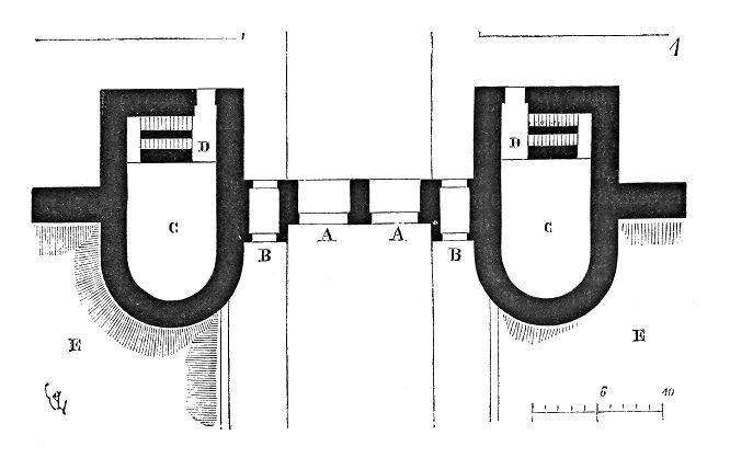 On a prétendu que cet édifice avait été une maison de péage parce qu’on y a trouvé des monnayes mais pourquoi des niches dans une maison de péage? On voit encore qu’il y a eu aux environs de ce monument, des batiments considérables. J’ai lu dans le même manuscrit que je viens de citer, que la rivière de Tavernay aiant débordée avec violence, emporta beaucoup de terre, et découvrit des vestiges de chambre, de célules, de pavés, de mosaïques et de ciment coloré. Ces batiments étaient peut-être la demeure des prêtres de Janus.