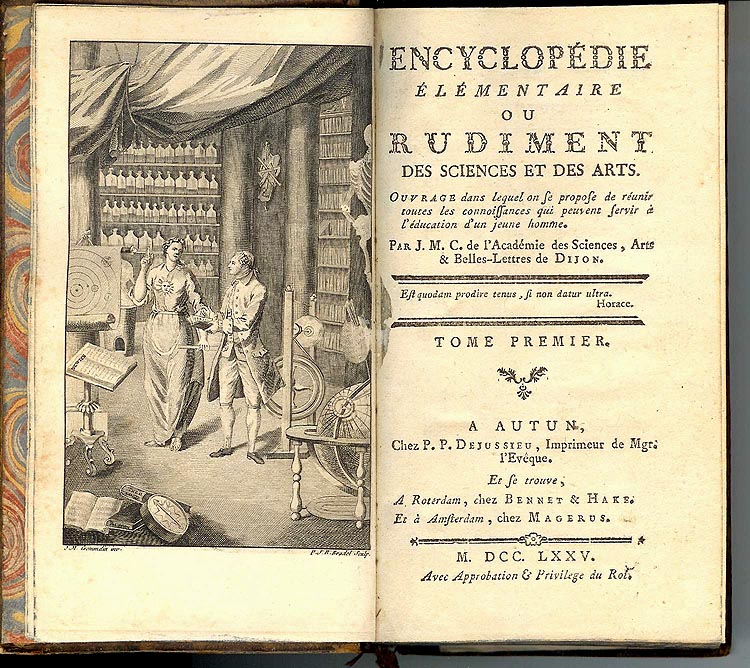 Govert Deketh's set of Encyclopedias.In 1775 Isaac Mathieu Crommelin published a 3-Volume Encyclopedia on Basic Arts and Sciences intended to bring together facts about a multitude of disciplines for the edification of a young student. In Isaac's own drawing, which appears as a fronticepiece, we see a young man consulting a book of knowledge and its Author who is perhaps God or some wise spirit such as 'Mother Nature'.