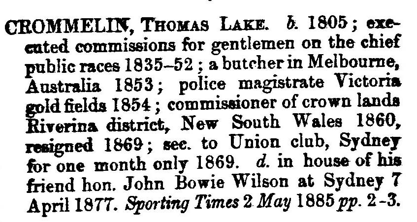 He married (2) ANNE BYLES May 30, 1860 in Braidwood, NSW, Australia. She was born Abt. 1829 in Lymington, Hampshire, England/Lymington, England, and died February 8, 1916 in Sydney, NSW, Australia.Thomas was the penultimate child of Charles Russell Crommelin and Anne Wilkinson (a well-connected Huguenot). Though he was born in India, he was reared mainly in England. He had money from his father and became involved with a fast and aristocratic set. He was a gambler and owned the winner of the Cambridgeshire Stakes in 1847, a horse named "The Widow". When he died, there were long obituaries in the English newspapers and in "The Field".