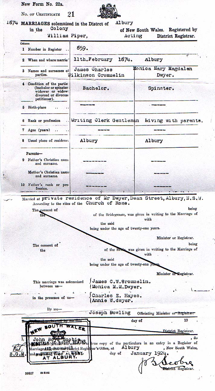 [1872 (after his shipwreck)] "After remaining a few days in Sydney, Father came for me and took me to Albury where he was then living at the Rose Hotel kept by Mr. and Mrs. King. Father was then Commissioner of Crown Lands for the Riverina. I then went to Gingerrick on the Murray to see my brother James. Gingerrick was managed by Mr. Sindwick. I stayed a few weeks there for my brother James was taken very ill with inflammation of the lungs and I had to help nurse him...[1877]"Some time later we (Mr. Brain and I) were living in the new house when I too came down with Ophtalmia and became quite blind. The hot water from my eyes burnt my cheek. We tried everything until Dodd told me soap was the best. So I made a good lather and it was wonderful how it soothed me. I got a little better, but had to leave on account of my eyes. The doctor in Walgett said if I remained there I should go blind. Just at this time I got a telegram stating my Father's death (1877). [Thomas Lake Crommelin died at Sydney 7 April, 1877. His warmhearted, gentlemanly nature is glowingly described in C. Fetherstonhaugh's book, "After Many Days."]
