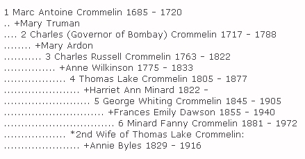 vi. LAURA HARRIET J. CROMMELIN, b. July 19, 1849, Finchley House, London England; d. September 28, 1885; m. CORNELIUS WALFORD, June 6, 1883.Children of THOMAS CROMMELIN and ANNE BYLES are: