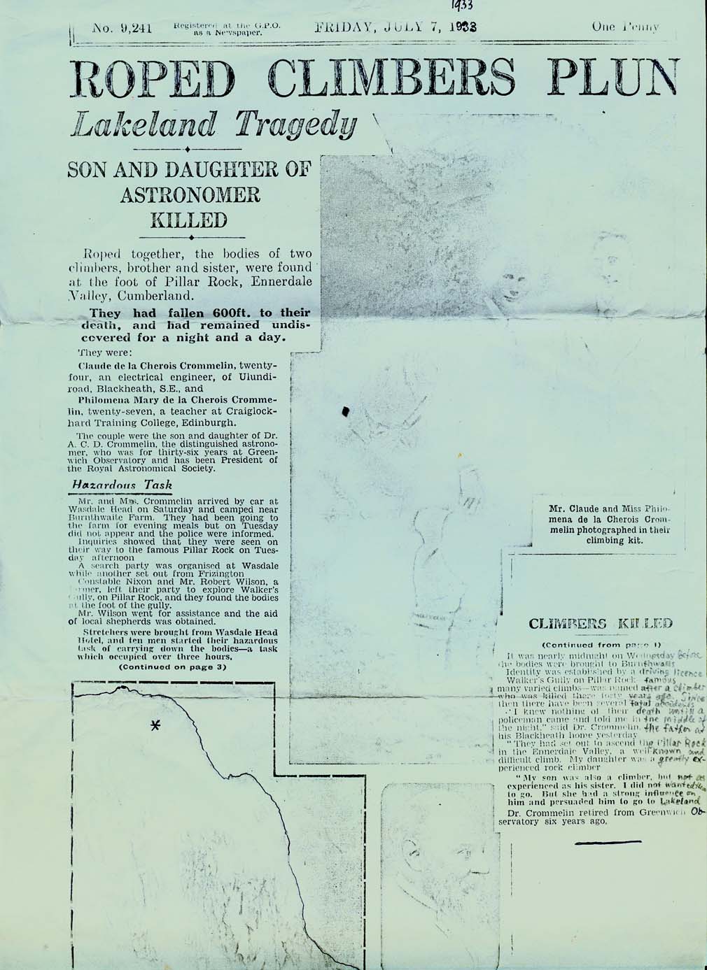 "I knew nothing of their death until a policeman came and told me in the middle of the night," said Dr. Crommelin, the father at his Blackheath home yesterday. "They had set out to ascend the Pillar Rock in the Ennerdale Valley, a well-known and difficult climb. My daughter was a greatly experienced rock climber. My son was also a climber, but not as experienced as his sister. I did not want them to go. But she had a strong influence on him and persuaded him to go to Lakeland."