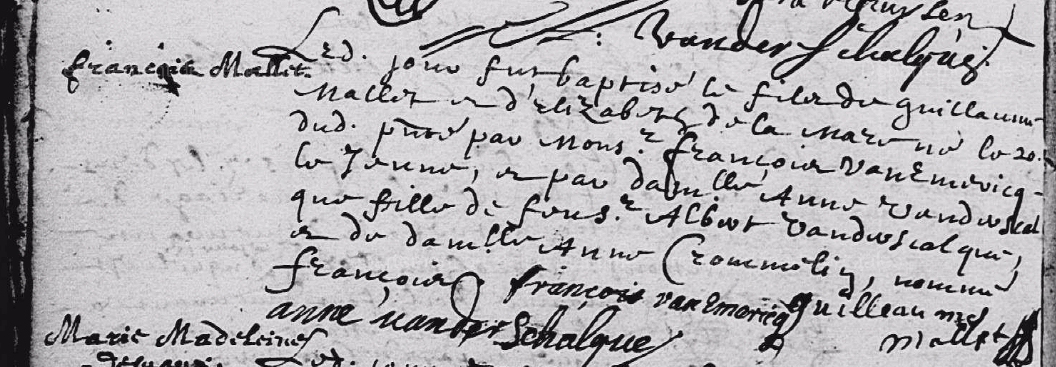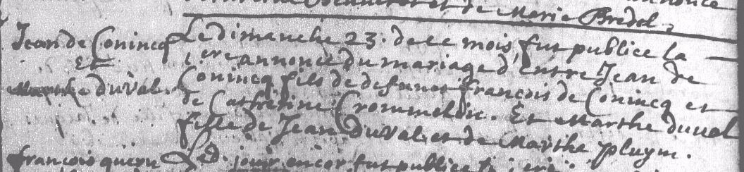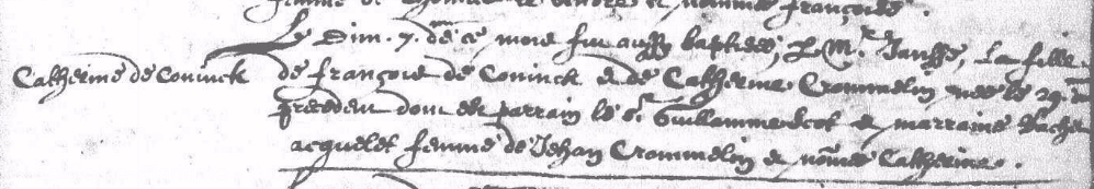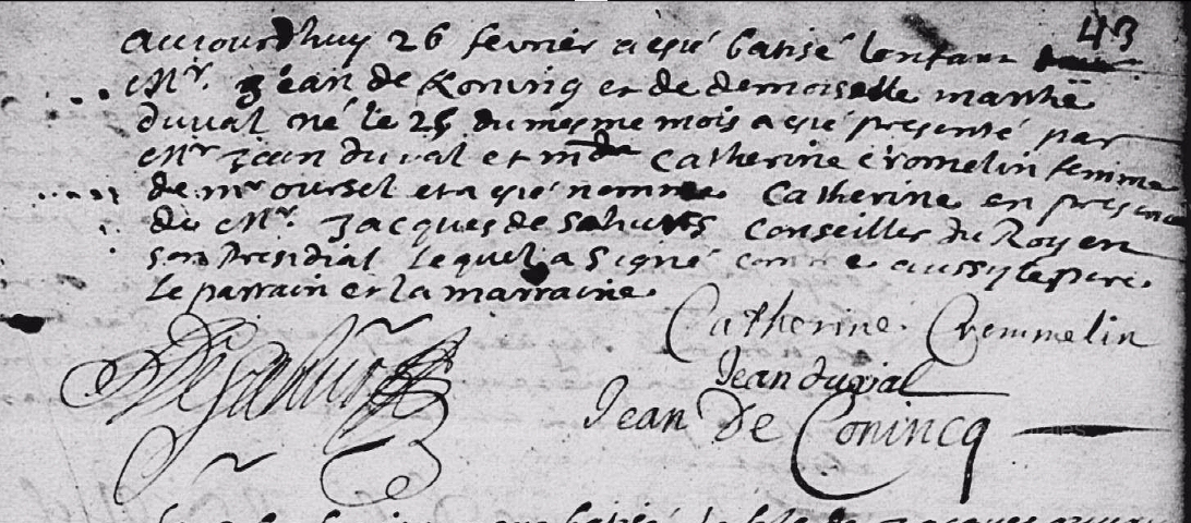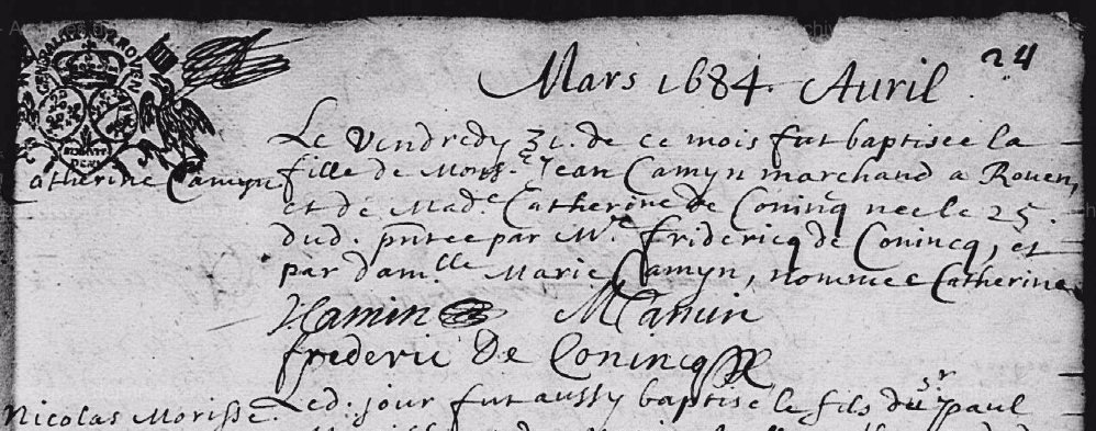 ![]() | 1685 February 25, birth of Catherine de Coninck ("Catin"), daughter of Jean de Coninck and Marthe Duval.