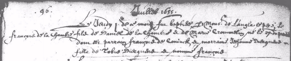 1655 June 27, birth of Francois de la Chambre, son of Daniel de la Chambre and Marie Crommelin