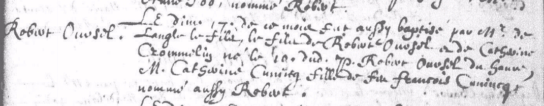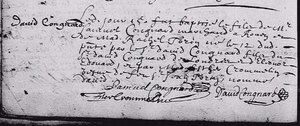 De Coninck and Crommelin FamiliesAlthough not all the church records of Quevilly still exist, those registers that have survived down to the present day indicate that this was a very vibrant church with numerous baptisms, marriages and funerals involving our distant relations. Our ancestors obviously took their faith and the church very seriously. The following are some of the special occasions recorded at Quevilly over 300 years ago.