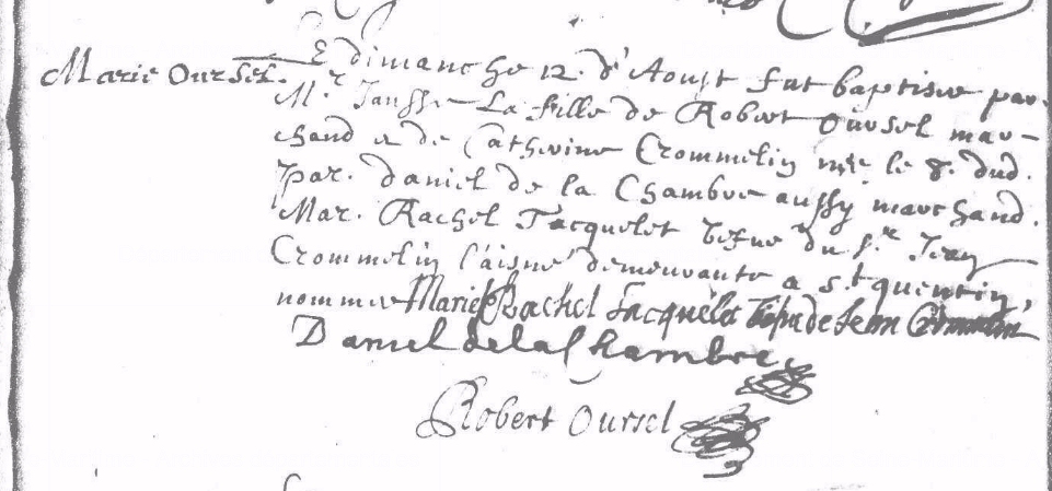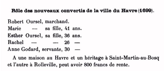 In 1699, a role of 'nouveaux convertis' in Le Havre shows the three sisters, Marie, Esther and Rachel, still living with their father. Incorrect ages are given. Marie would have been 31, Esther 29, Rachel 26. A servant lady, Anne Godard, has replaced their mother, Catherine Crommelin, who died in 1694. Their brother, Robert Jr., died in 1693 in Jamaica of yellow fever. Since Catherine's death, the Oursels inherited two properties at Saint Martin au Bosq and Rolleville which were being rented out.
