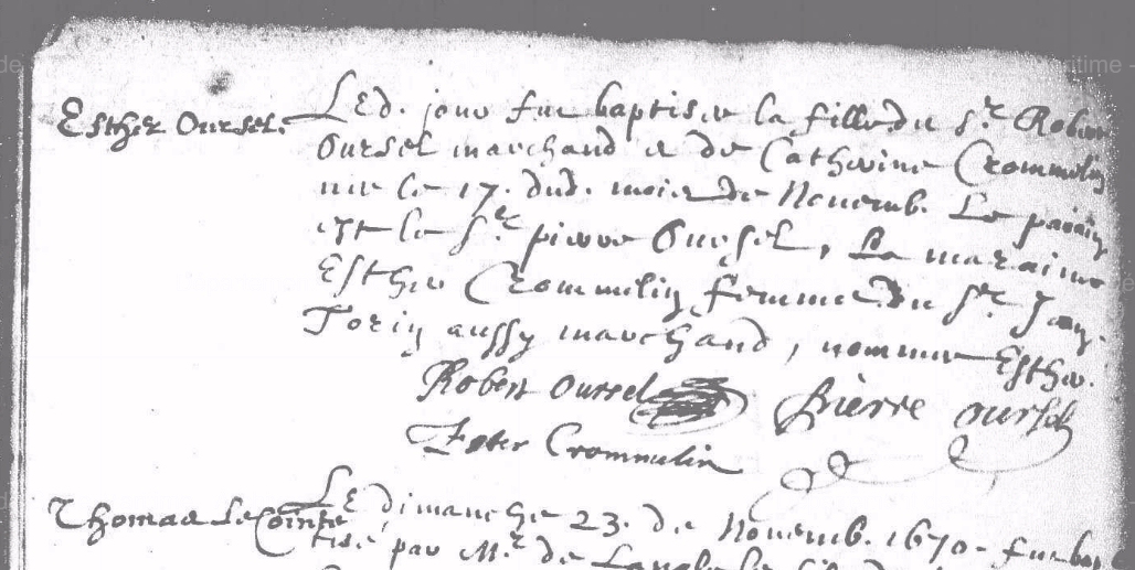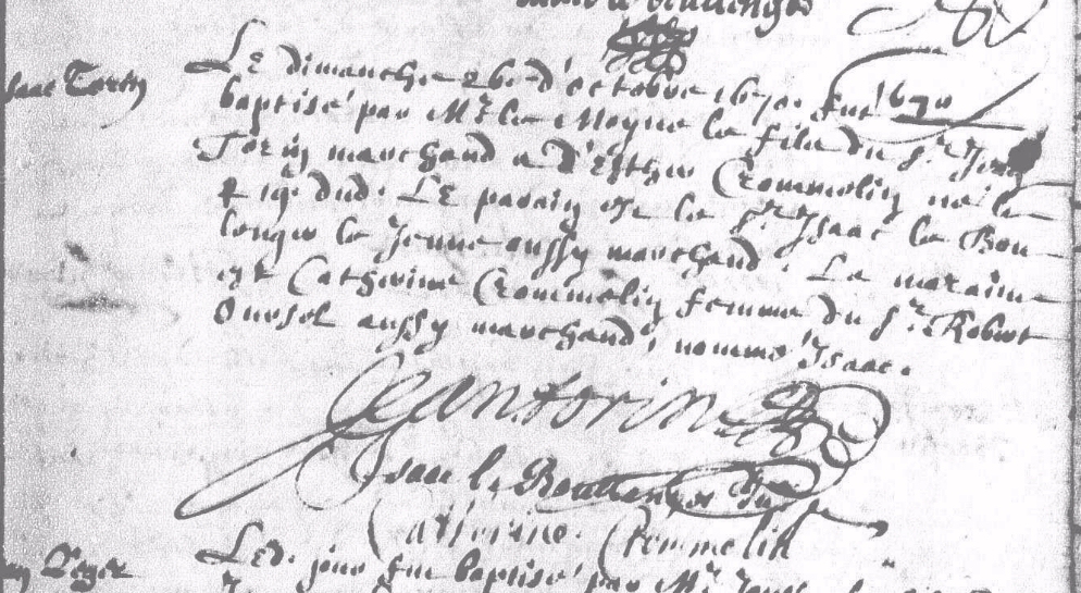 Esther Crommelin, widow of Jean Torin, attending a baptism in December 1678.