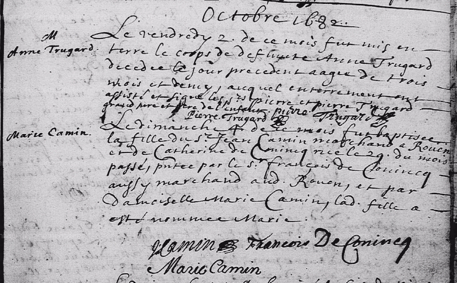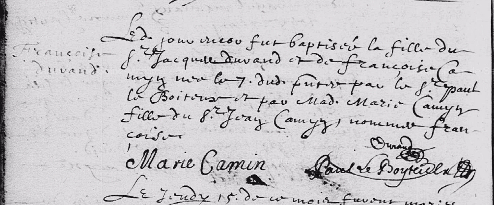1674 November baptism (above) of Francoise Durand, niece of Marie Camin ("Mayon"). The baby was the daughter of Jacques Durand and