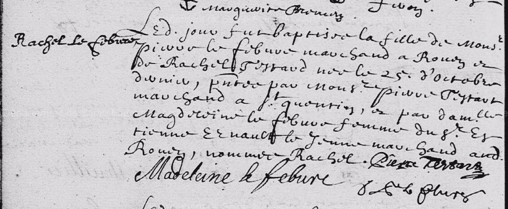 He died in his mother's (Rachel Tacquelet's) arms in his 24th year.[Note: In the registers of the Protestants at Rouen, one's home was designated simply by mentioning the Catholic parish where one lived. The above 3 deceased people apparently lived in the "paroisse" St. Eloy although they attended the Protestant temple at Quevilly.]