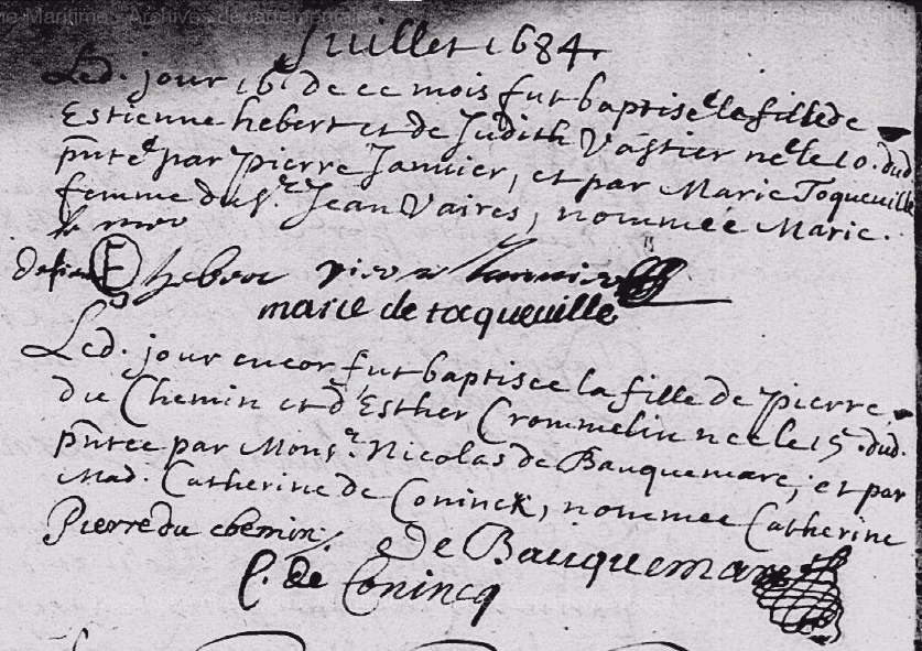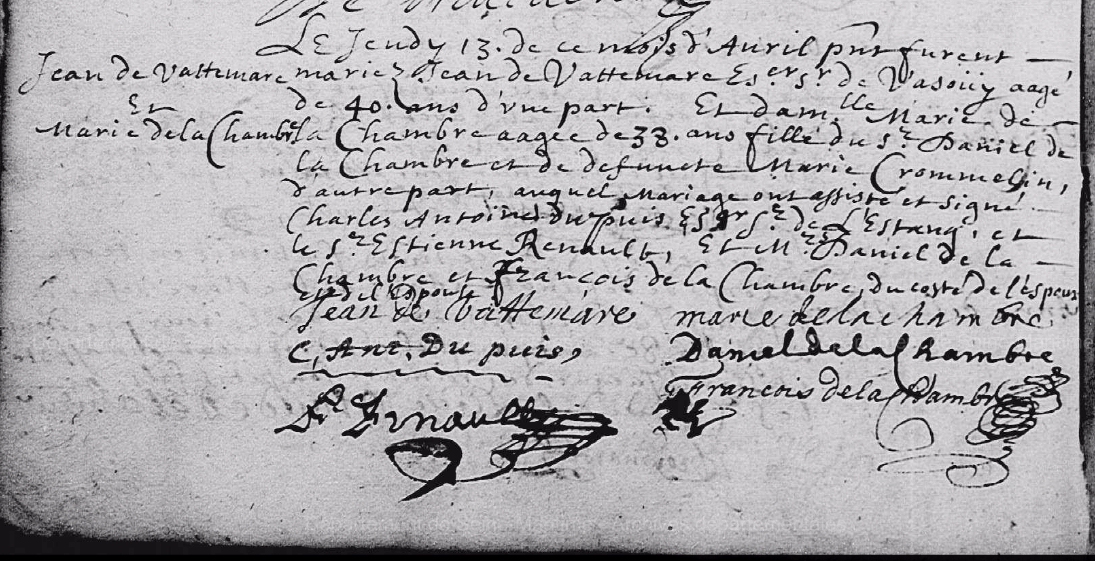 1684 April 13, marriage of Jean de Vattemare and Marie de la Chambre, daughter of Daniel de la Chambre and the late Marie Crommelin (another older sister of Daniel).