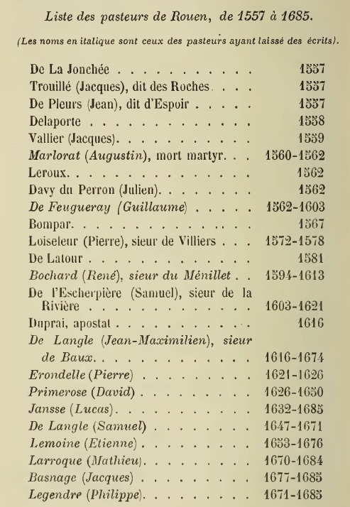 DUBIEF, Henri et POUJOL, Jacques, La France protestante, Histoire et Lieux de mémoire, Max Chaleil éditeur, Montpellier, 1992, rééd. 2006, 450 pages- FARIN, François, Histoire de la ville de Rouen, Louis du Souillet, Rouen, 1731