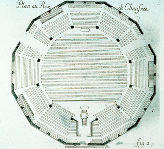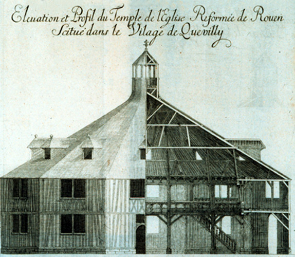 Outside the city, as stipulated by the Edict of Nantes, the Quevilly temple was built on a centred plan. It was a dodecahedron about 30m long and maximum 22m high, lighted by 60 double windows, with a skylight on each side. Construction began in 1600 and was completed in 1601. The walls of the edifice were built on a firm foundation of brick and timber like the one built by the Protestants in Dieppe in the same period. It was a marvel of acoustics, having no pillar inside and having all the woodwork resting on a central keystone. A three-tiered tribune featured on all twelve sides. Pews in the centre and along the twelve sides enabled worshippers to focus on the pastor's pulpit and they enabled the building to hold large congregations. In 1685, following the Revocation of the Edict of Nantes, the Quevilly temple was destroyed.