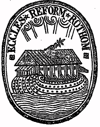 The seal of the consistory of Rouen was discovered in 5 volumes of a book called "Germanicarum rerum veteres scriptores" published in Frankfurt in 1600 and 1607. This book was purchased at a second-hand bookshop (bouquiniste) in Paris around 1853. The five volumes once belonged in the library of the Reformed Church of Rouen in the 17th century. The stamp depicts Noah's Ark floating on the waves. It is a roundish vessel showing a dove on the roof with an olive branch in its beak, the symbol of peace returning to the earth.