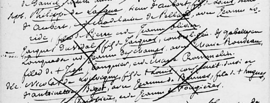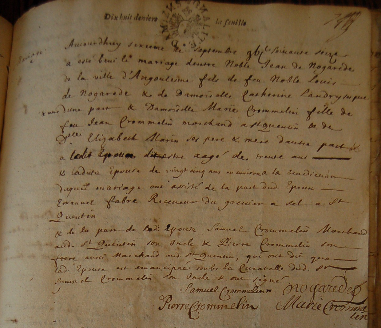 6 September 1676 - Marriage of Marie Crommelin, daughter of Jean Crommelin and Elizabeth Marin, to Jean de Nogarede at Lehaucourt temple (St. Quentin).