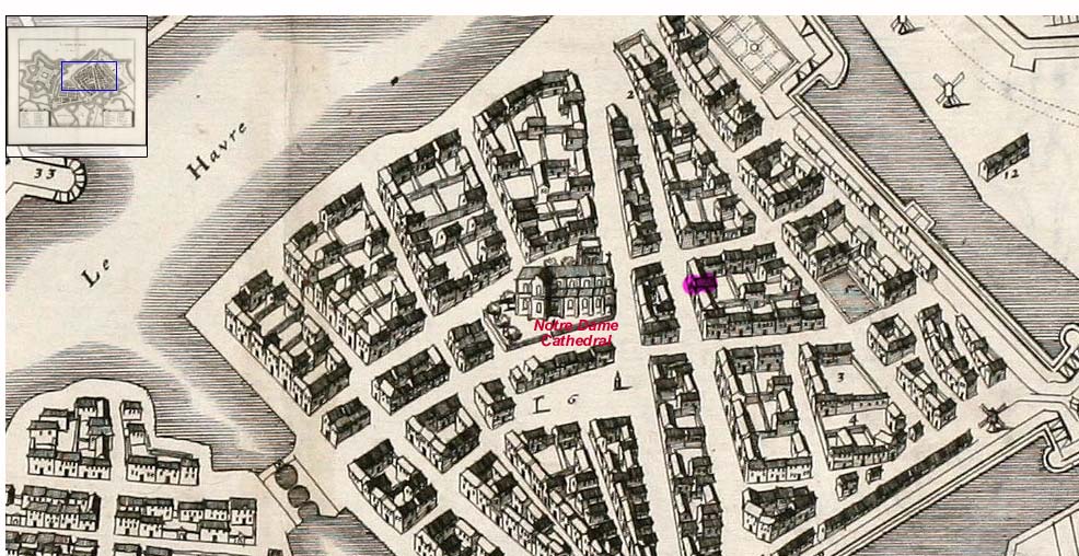 The deConinck/Crommelin residence in Le Havre in the late 1600's (pink dot)