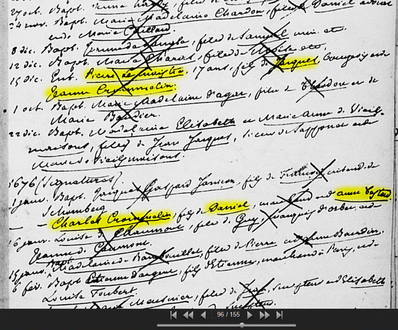The year 1676 happens to begin with the baptism of Charles Crommelin. All Crommelins alive today (except for the van Wickevoort-Crommelins) are descendents of this one child.At this time Daniel and Anne Testart were living in Paris. They were married two years earlier in 1674 at Lehaucourt temple (St. Quentin). Daniel was the business partner with his older brother, Jacob, and Elizabeth Testart (sister of Anne). They had started a partnership in banking but after working together for only 8 months the partnership dissolved and Daniel went off to try other pursuits. He may have stayed in the banking business, but independent of his brother. Jacob carried on with the banking business in Paris but eventually lost a great deal of money. Years later he went back to the Crommelin Linen Works at St. Quentin which he still owned. He liquidated it shortly after the Revocation of the Edict of Nantes in 1685.