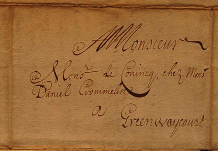 As we enter a new year I wish you all sorts of prosperity. Pray God that He blesses you to be abundantly productive in all your plans to the depths of your desires. My wife greets you and wishes you the same, and also my uncle and aunt Crommelin [Daniel Crommelin and Anne Testart], and their household. I am, monsieur my brother, your very obedient servant, Jean de Conincq