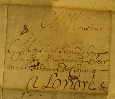 3 January 1686 - Letter to Frederic c/o of his cousin, Jean de la Chambre in London, from younger brother, Jean de Coninck, in Rotterdam.