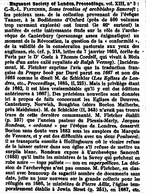 At Boughton Malherb, more in the Wealden district, but not far distant from Maidstone, a small company, under the Marquis de Venours, settled when driven from France in 1685. A French service was arranged in the parish church, and Archbishop Sancroft showed much liberality in this matter, appointing one Monsieur Rondeau to perform service for the strangers in their own tongue. Similar permission was given for their worship in the churches of Leeds and Hollingbourne, also in the Maidstone district.![]()