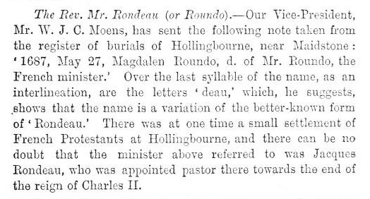 Jaques Rondeau had been the Huguenot pastor at Le Plessis-Marly near Longvilliers, a village north-west of Dourdan towards the Rambouillet forest. The following excerpt from Memorials of Old Kent tells a little more about him.