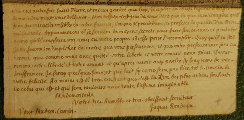 Yesterday I received a letter from our dear Mayon written on the 25th. She's still at the same place. I was so worried that she might have been taken to that horrid place, Aumalle. Of all the places in the world, I hope she isn't taken there soon. It seems things are relaxing a bit. The company [of dragroons] are about to vacate for the countryside where there are greater quantities. May our good God help us. There's no need to mention how much I love this virtuous girl. I have as much affection for her as it's possible to have. She informed me that you told her about the arrival of madam Gontier with her daughters. [Sara Guiselin, wife of Jean Gontier, and her older daughter had been arrested with Marie Camin in a first attempt at escape aboard the royal yacht at Dieppe. (Legendre, p.80)].
