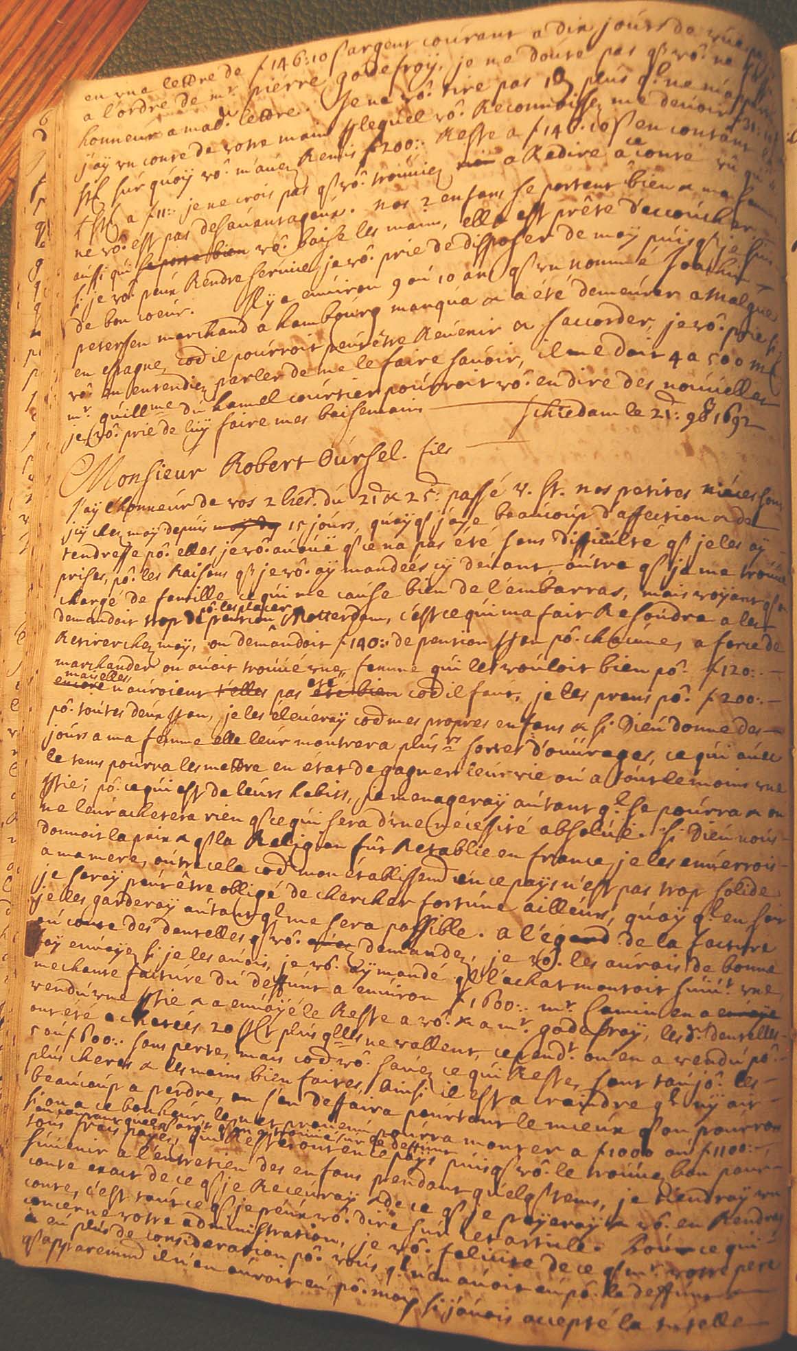 I received with joy your letter of the 11/21 current in which you remit some money against your account balance - a note in the amount of f200 on Mr. John Ribot of Amsterdam which he accepted. I am grateful for your business. I hope that it will continue. Now that you have begun, may you in due time remit the outstanding balance so that we might close this transaction and no longer have to mention it. I pray God that He causes these plans to succeed more and more and that He gives you all sorts of satisfaction and contentment in your business.