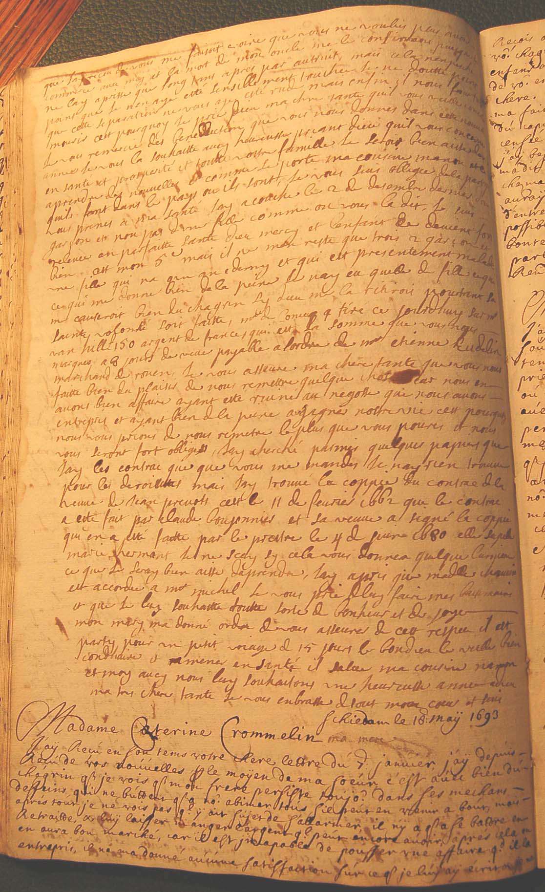 He outlines in detail in a written diatribe that the moment your dear father died I affected him deeply because I didn't remarry at the end of the year instead of waiting nearly 4 years. [About 3 1/2 years elapsed between the death of his father, Francois de Coninck, and Catherine's marriage to her second husband, Robert Oursel Sr.] That is necessary [so that a young boy isn't fatherless for too long]. That is his reasoning which underlies his attitude. I would have been quite miserable to fall into the grip of this notion which he has. He claims that I sold silverware and gold chain which isn't true. O what a wretched individual! He knows I shared everything with you faithfully. I bid you, my dear son, to tell me if you know to whom he sold his gold chain at Rouen. If I had wanted to make ill use of it, it wouldn't have been done mentioning your name. I didn't give away heirlooms twice. On the contrary, and I take God as my witness.