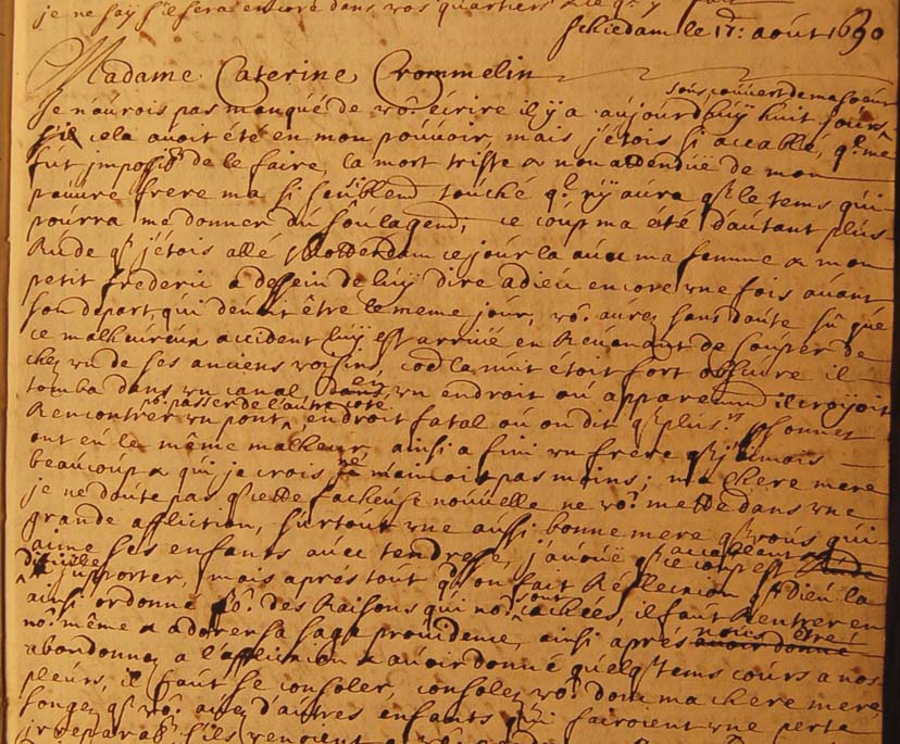 It is still quite a difficult subject despite appeals over a great number of years. All the family wrote to you on this matter however you remain quite inflexible, without wanting to reply. Or, if you do answer, it is in an unsatisfactory way by saying that it is necessary to take up a collection amongst the family while you have enjoyed with your ease of more than 25 years, wealth which with interest has grown to a considerable capital.This poor young woman (Catherine de Coninck) is in a dreadful state while you hold her wealth. You have means; you are able to expand; you have slaves; you enjoy abundance, therefore this inflexible conduct defies reason. In the name of God, my uncle [Jacob Crommelin] appeals to you, pointing out your justice, to return that to whom it belongs, considering that you are now in advanced age and soon will be at the end of your career, or it will be necessary for you to give an account to the great Judge of the Universe Himself. He wishes to touch your heart so that you can as soon as possible resolve this business which humanity cries against you and yours.