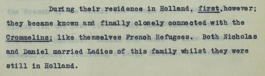is mistaken as to when and where Nicholas and Marie Testard-Crommelin were married [London, 1693].If a malicious rumour hadn't spread throughout the Crommelin 'network' then the Irish line of our family would have evolved quite differently. For instance, there would have been no Carrowdore Castle built in 1818, no authoress May de la Cherois Crommelin, or astronomer Andrew Claude de la Cherois Crommelin, and no town called Newtown-Crommelin, etc.