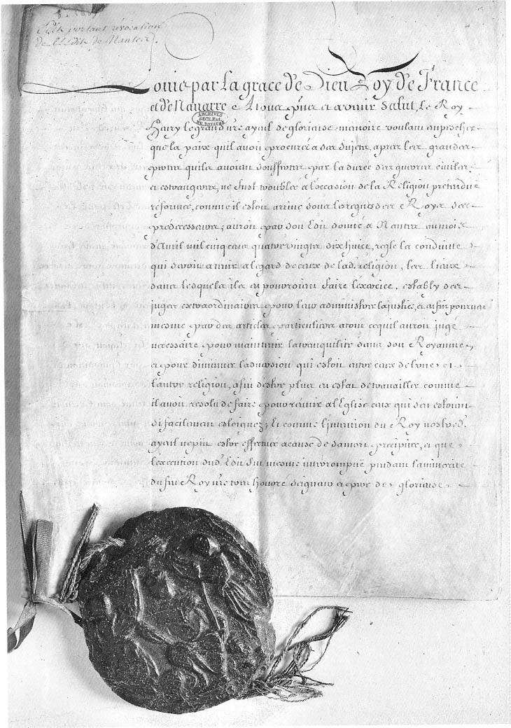 Louis, by the grace of God king of France and Navarre, to all present and to come, greeting:King Henry the Great, our grandfather of glorious m emory, being desirous that the peace which he had procured for his subjects after the grievous losses they had sustained in the course of domestic and foreign wars, should not be troubled on account of the R.P.R., as had happened in the reigns of the kings, his predecessors, by his edict, granted at Nantes in the month of April, 1598, regulated the procedure to be adopted with regard to those of the said religion, and the places in which they might meet for public worship, established extraordinary judges to administer justice to them, and, in fine, provided in particular articles for whatever could be thought necessary for maintaining the tranquillity of his kingdom and for diminishing mutual aversion between the members of the two religions, so as to put himself in a better position to labor, as he had resolved to do, for the reunion to the Church of those who had so lightly withdrawn from it.